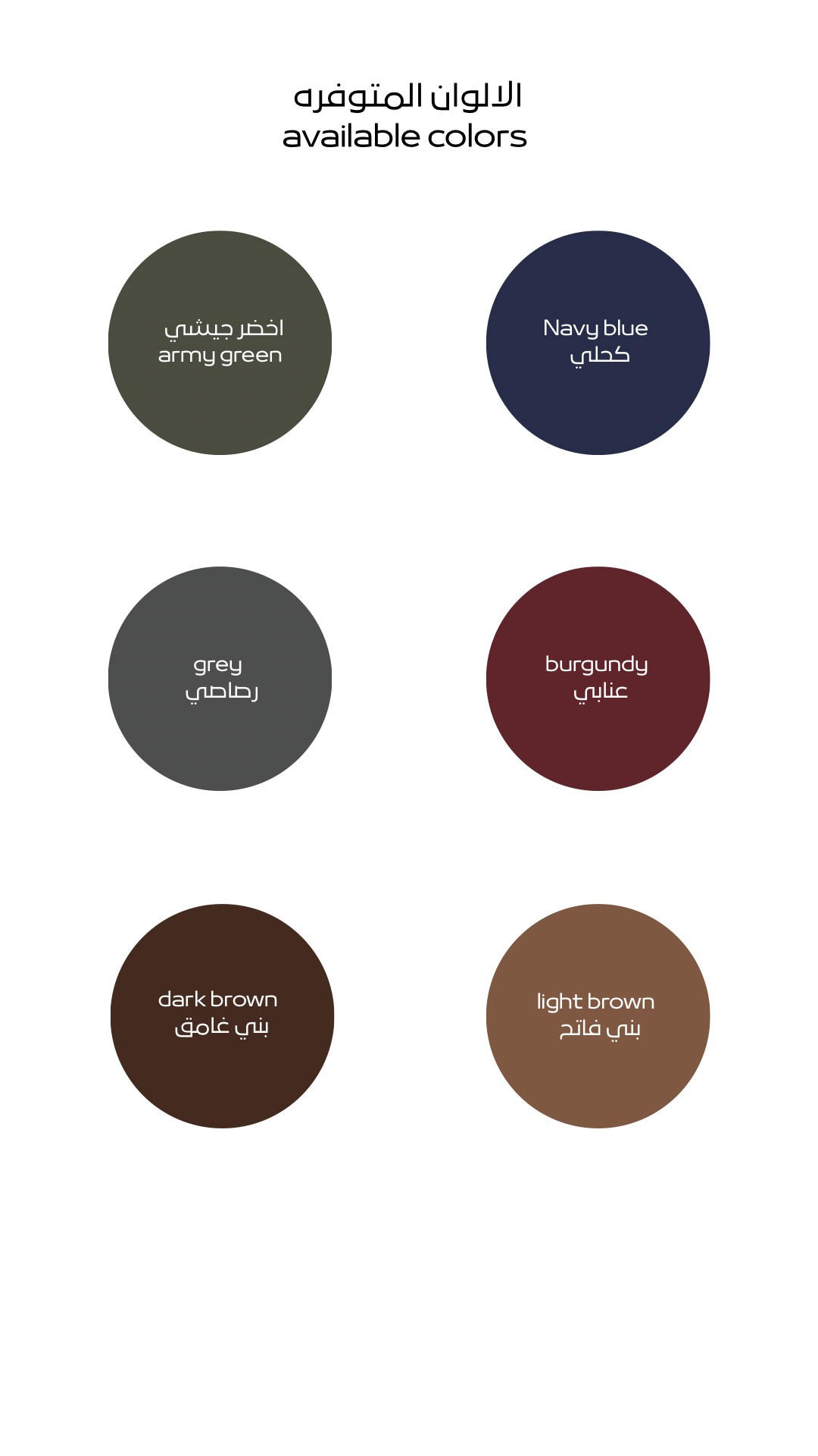 | Color * | Green olive, Black, Dark Brown, Gray, Light Brown, Maroon, Navy blue, Pink, Purple |